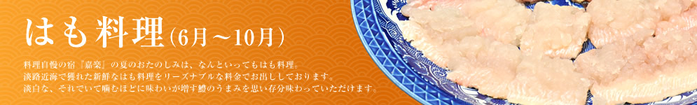 当館の鱧(ハモ)料理の特色は、鱧の湯引きには梅肉・ぽん酢・酢味噌の三種類のたれがついています。 定番の梅肉・さっぱりとした味わいのぽん酢・また淡泊な鱧の身に酢味噌の味わいは絶品です。 また、鱧鍋は当館特製の秘密の塩だれを使用し、淡路産の玉ねぎが入っています。 玉ねぎの甘い味わいがつゆや鱧の中にしみ込んで、絶妙なハーモニーが口の中に広がります。